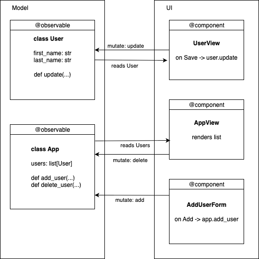In the declarative version, you think model-first: the model is a set of classes, and the data their objects hold is the single source of truth. In our CRUD app, the model consists of User (persisted fields first_name, last_name) and a top-level App that owns users: list[User] plus actions like add_user(first, last) and delete_user(user). Both classes are marked @ft.observable, so assigning to their attributes (e.g., user.update(...), app.users.remove(user)) triggers re-rendering — no page.update().